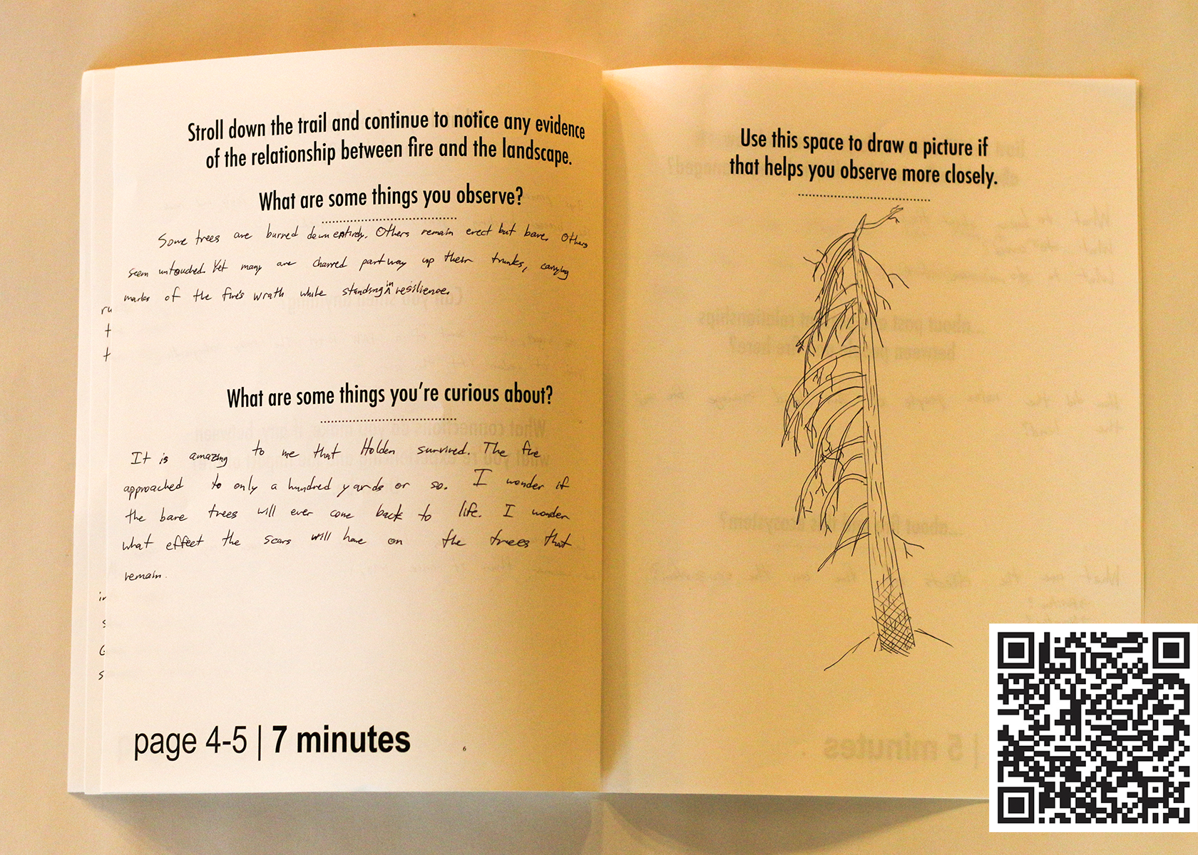 Participants’ nature journals generated ideas for the trail itself, and resulted in data that we used for simple front-end evaluation. Scan QR code to see our evaluation report.
