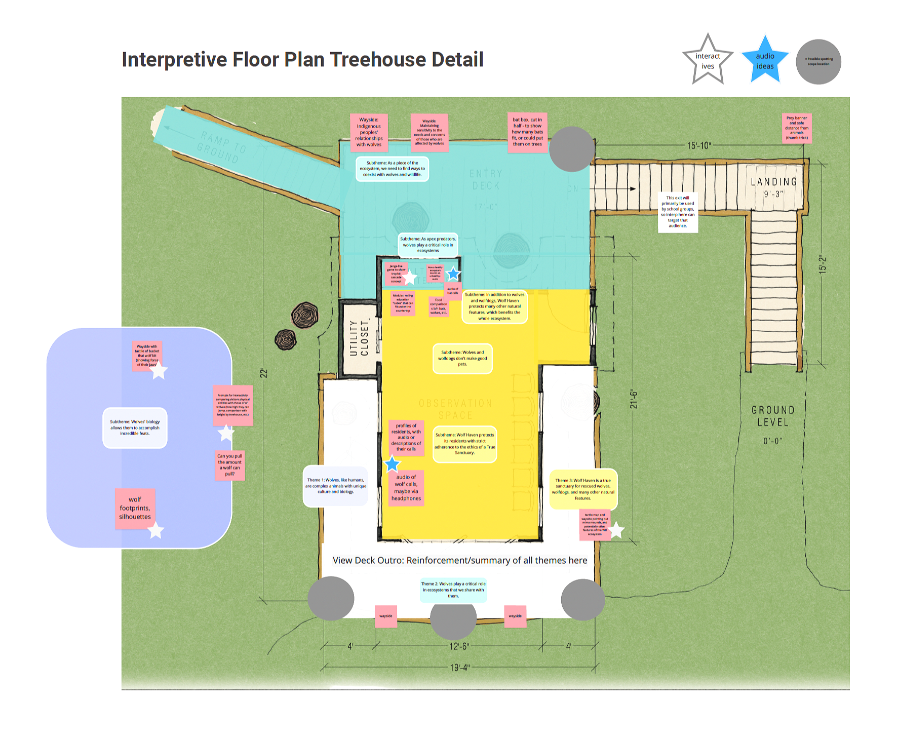Our interpretive plan become schematic when we laid it onto the treehouse floorplan.